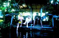 resort hinter timehri. ein kleiner weiher mit insel, darauf ein einstöckiger